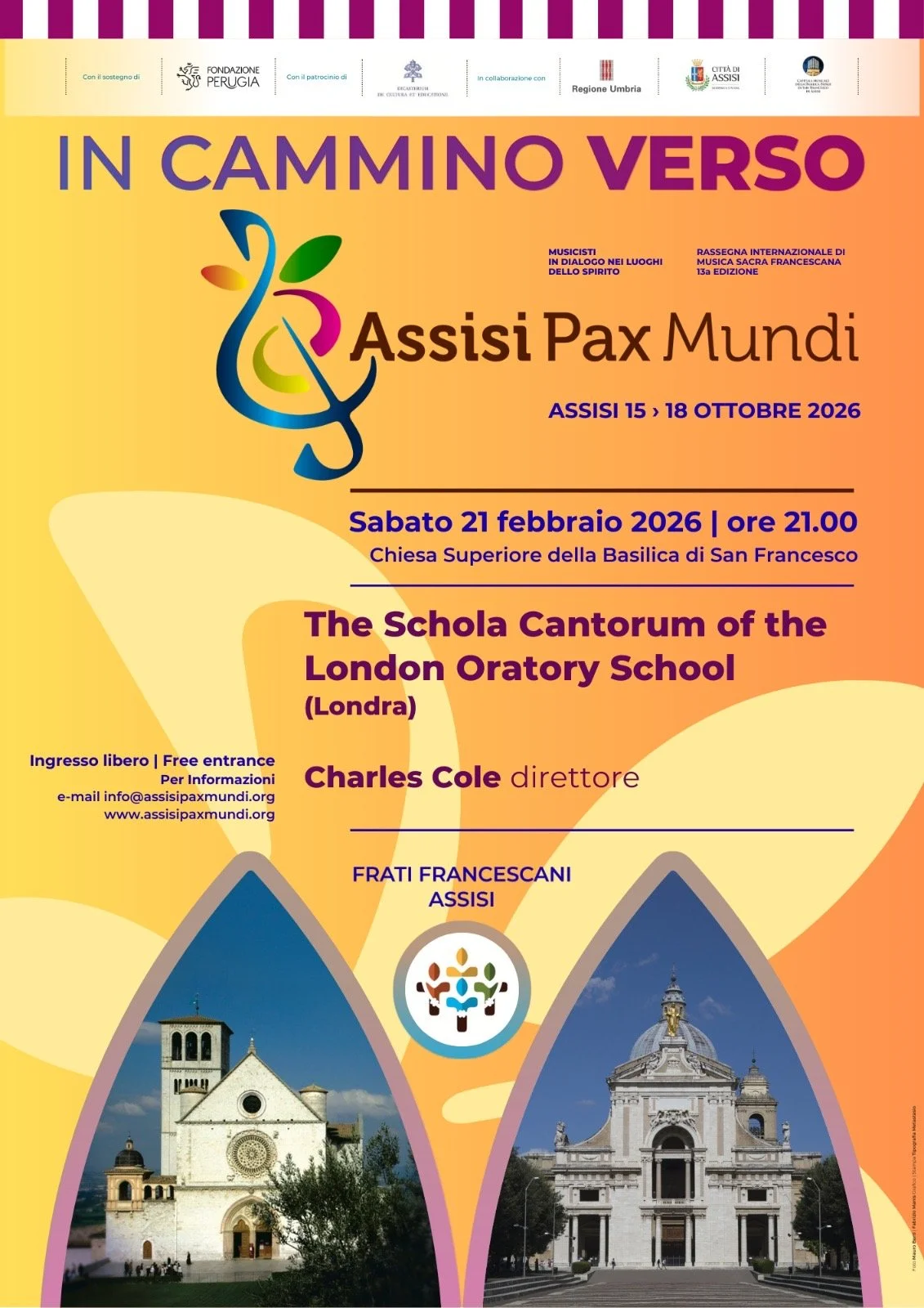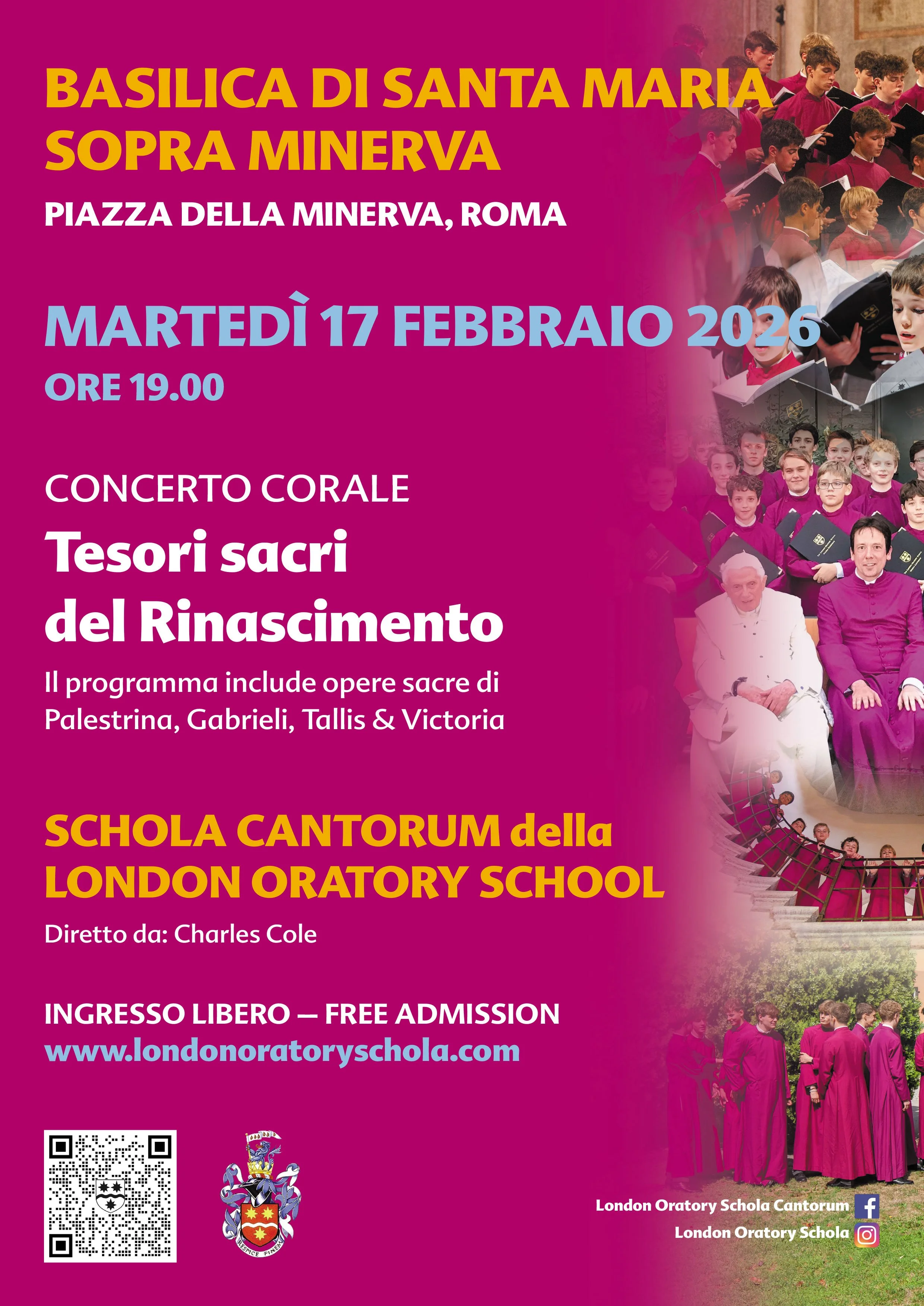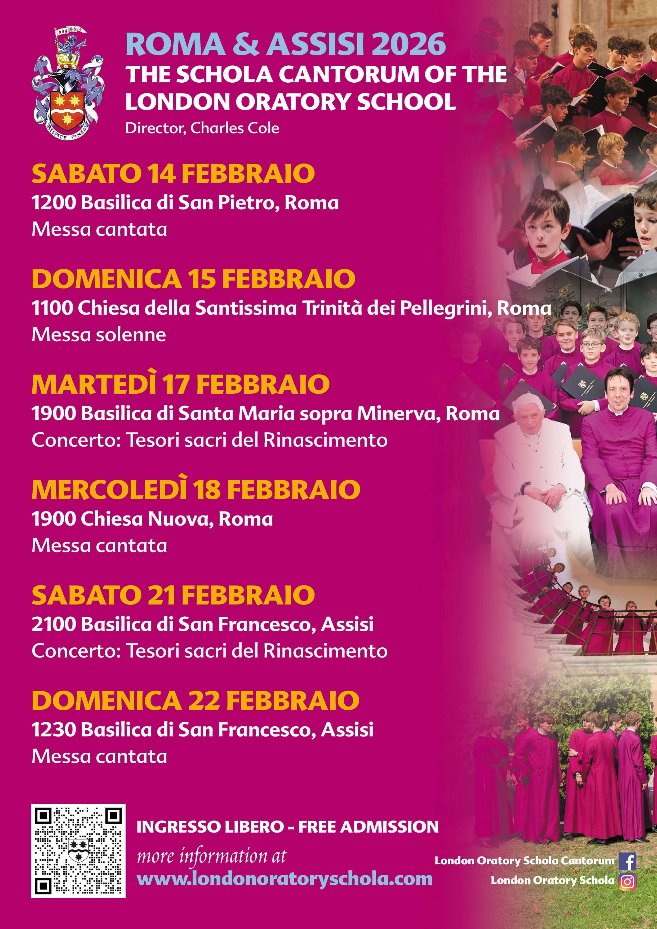 The London Oratory Schola will be going on tour to Rome and Assisi in February 2026. The choir will be singing Masses at St Peter’s, Santissima Trinità dei Pellegrini, the Chiesa Nuova and the Basilica of San Francesco in Assisi. Additionally the Schola will give two concerts, the first at the Basilica of Santa Maria sopra Minerva, and the second at the Basilica of San Francesco. A particular highlight will be singing Mass on Ash Wednesday at the Chiesa Nuova, including the Miserere by Allegri who is buried there. Our concert in Assisi will take place on the eve of the first public veneration of the body of St Francis, which is being exposed publicly for the first time to mark his the 800th anniversary of his death in 1226. The concert will include music written in honour of St Francis by renaissance composers Willaert and Guerrero.